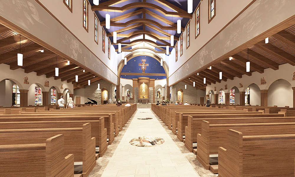 When architect Erica Markussen asked if the new church design should reflect a unifying principle, the growing devotion to St. Clare provided a clear answer. Inspired by the Basilica of St. Clare in Assisi, the new church’s design would feature layered stonework, basilica-style arches and wooden beams — culminating in a striking 12-foot San Damiano crucifix above the sanctuary.